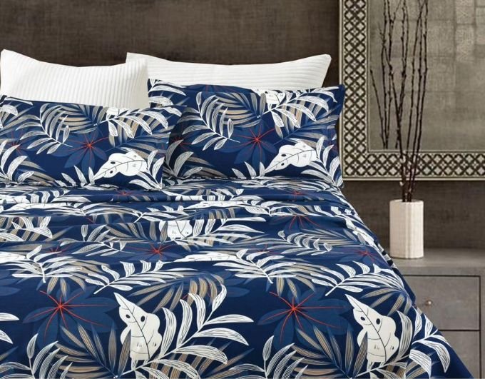Juego de sábanas estampadas color azul con hojas blancas de 600 hilos 50% Algodón. De muy buena calidad
